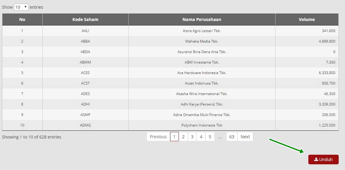 Coba Anda perhatikan, di sana ada tiga menu yang telah dicentang sebelumnya, yaitu Nama Perusahaan, Kode Saham dan Volume suatu perusahaan. Untuk tahapan selanjutnya, Anda bisa meg-klik “Unduh” yang terdapat di bagian bawah dan telah diberi panah hijau.