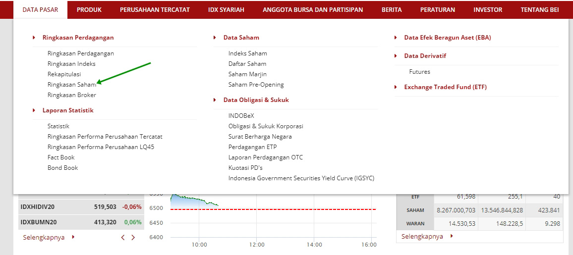 2. Lihat pada menu “Data Pasar”, kemudian klik sub menu “Ringkasan Saham” yang telah kami diberi panah berwarna hijau.