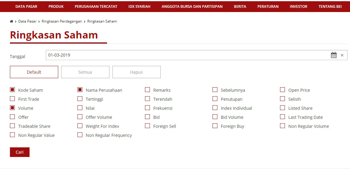 Selain menu tanggal, Anda juga bisa melihat berbagai macam menu, seperti menu Kode Saham, First Trade, Volume, Offer, dan sebagainya. Nah, cara mencari data volume perdagangan saham, maka Anda dapat memilih atau mencentang Volume. Tapi ingat, Anda jangan hanya mencetang volume saja, pastikan juga Anda mencentang setidaknya Nama Perusahaan dan Kode Saham. Kenapa demikian? Itu agar Anda dapat melihat jumlah volume perdagangan setiap perusahaan dengan mudah.